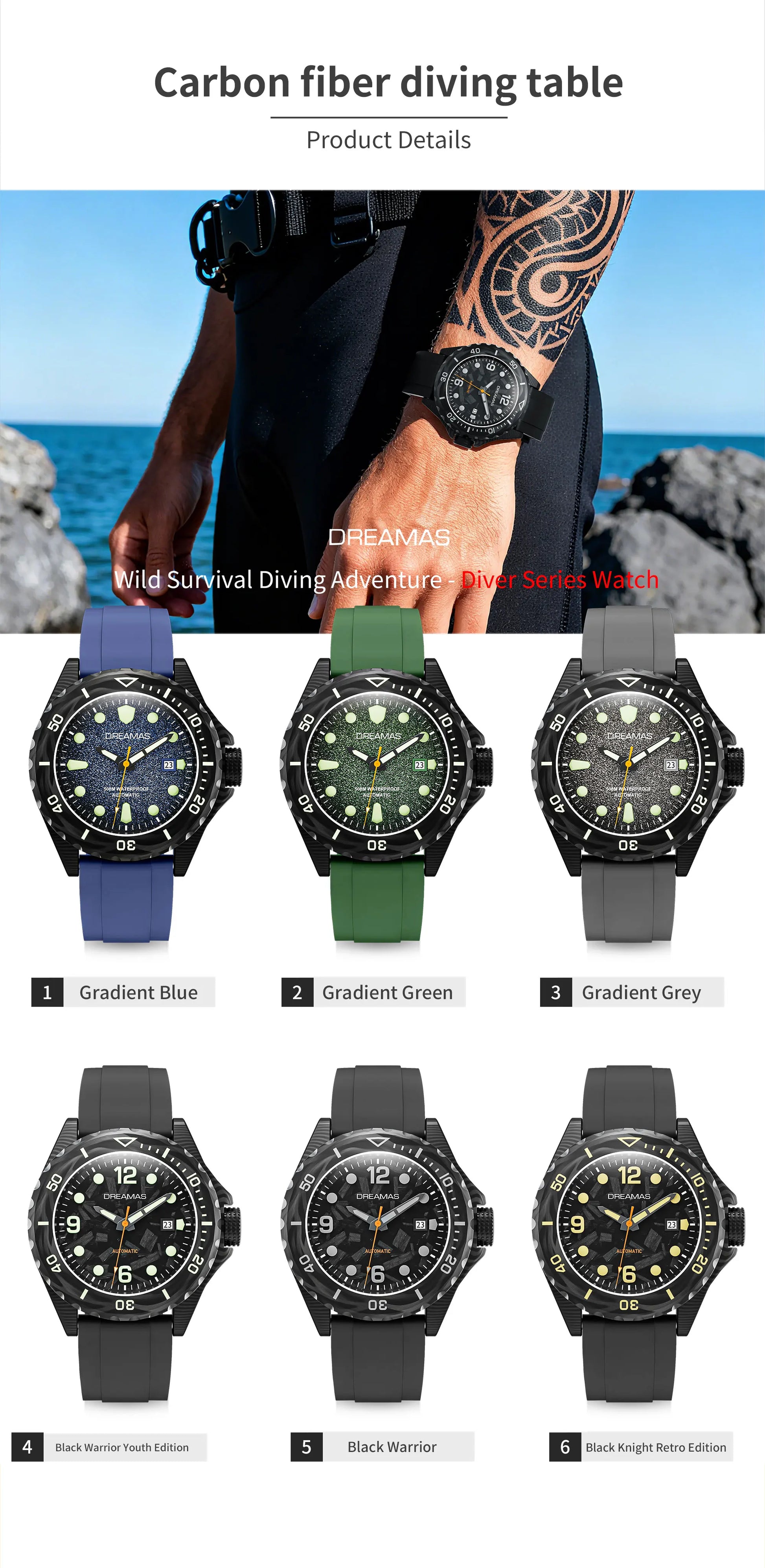 1,Watch Case: The classic models are crafted with titanium alloy combined with DLC (Diamond-Like Carbon) hard coating, which is lightweight, sturdy, highly resistant to wear and corrosion. The carbon fiber version (the special Black Warrior edition) is made of carbon fiber material, presenting a strong sense of technology.