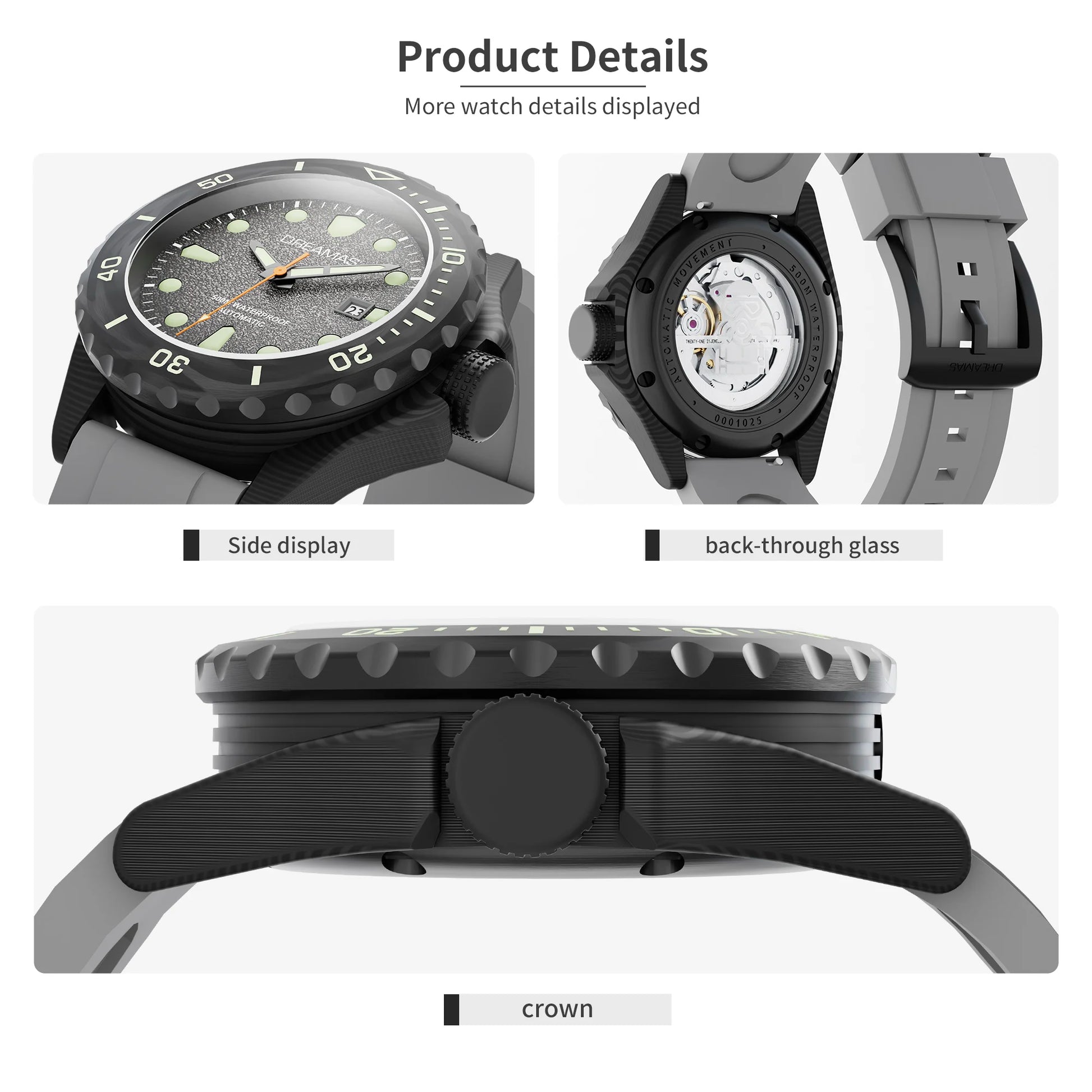 1,Crown: The screw-down crown is made of titanium alloy with DLC hard coating. It operates smoothly, is durable and has good sealing performance.